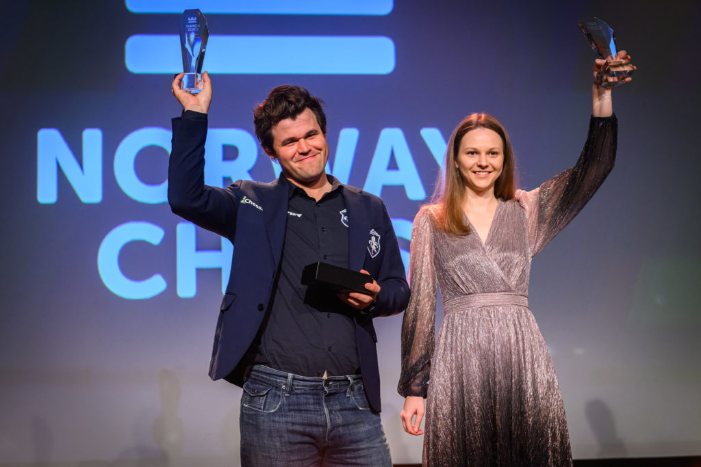 The 2025 Norway Chess Champion, GM Magnus Carlsen, and the Norway Chess Women Champion, GM Anna Muzychuk | Photo: Michal Walusza